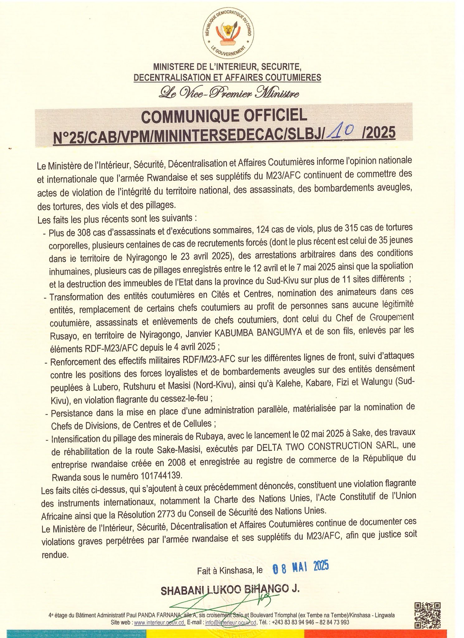 Le Ministère de l’Intérieur, Sécurité, Décentralisation et Affaires Coutumières confirme sa détermination de documenter sur violations graves perpétrées par l’armée rwandaise et ses supplétifs du M23/AFC, afin que justice soit rendue.